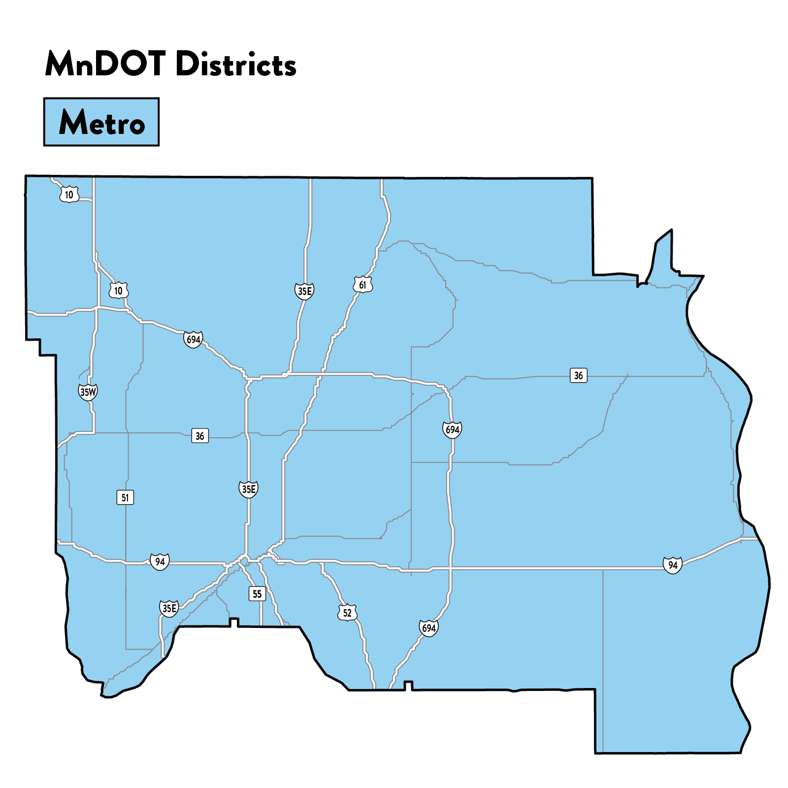 Congressional District 4 covers almost all of Ramsey County and about a portion of Washington County. It is located entirely within MnDOT Metro District. Interstate highways I-94, I-694, I-35W and I-35E pass through the district.
