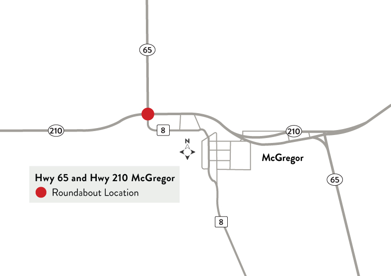 Aitkin County was awarded Transportation Economic Development (TED) Program funding to construct a roundabout at the west junction of Hwy 210 and Hwy 65 in McGregor. MnDOT is the lead agency on this project, which will improve safety and traffic mobility at the intersection.