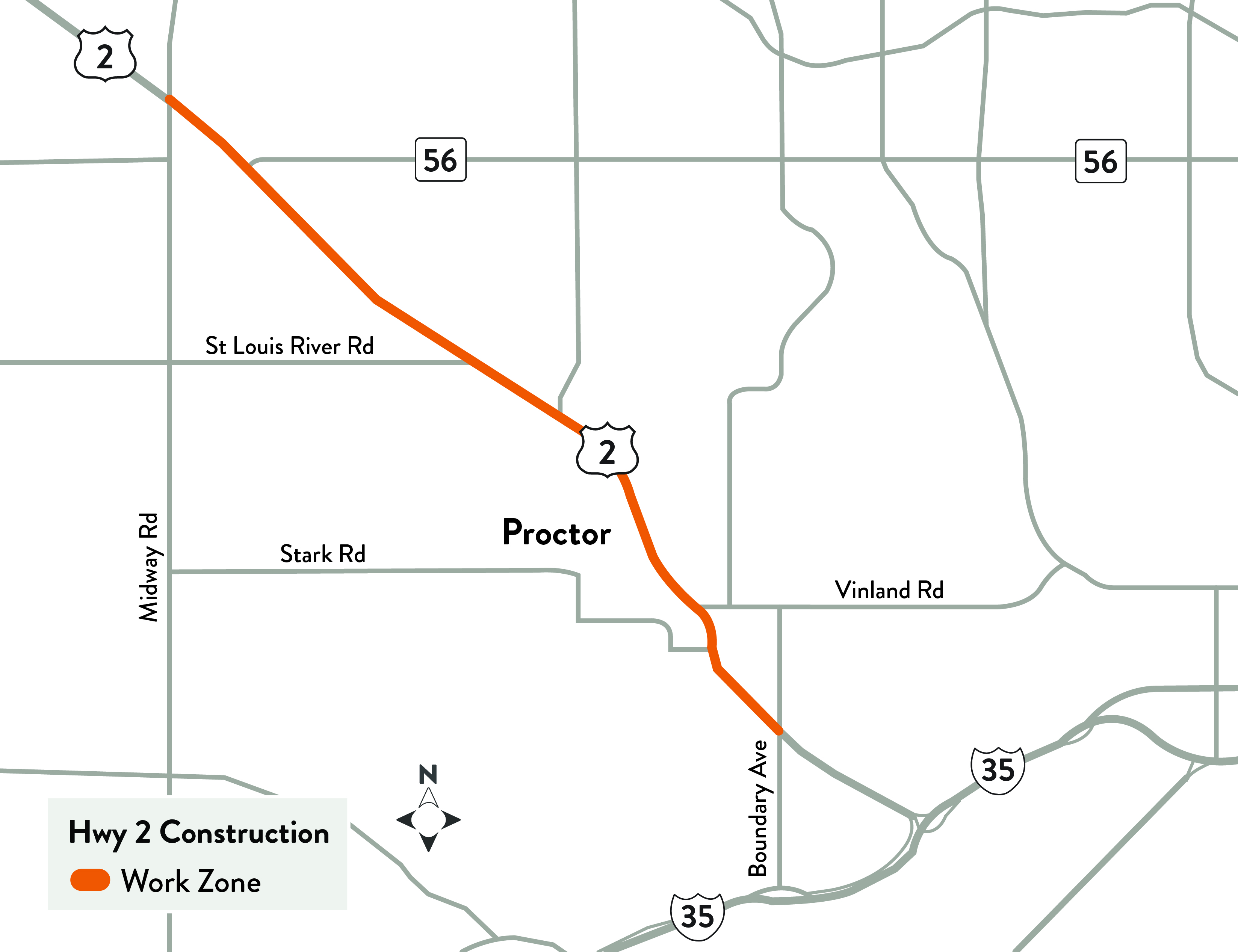 This project includes 4.8 miles of bituminous mill, overlay, pavement reclamation, ADA improvements through Proctor, and a new signal with safety and intersection improvements at Boundary Avenue. A portion of the project will require a detour.