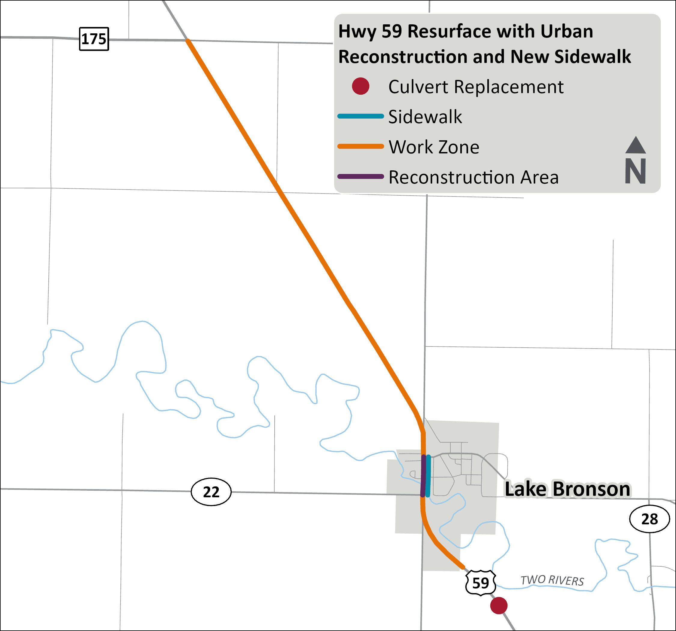 The Minnesota Department of Transportation plans to resurface Highway 59 from the east limits of Lake Bronson to Highway 175. The project also includes an urban reconstruct of pavement, sidewalks, storm sewer, lighting and utility improvements. A culvert located one-half mile south of Lake Bronson will also be replaced. The project is scheduled for construction in 2028.