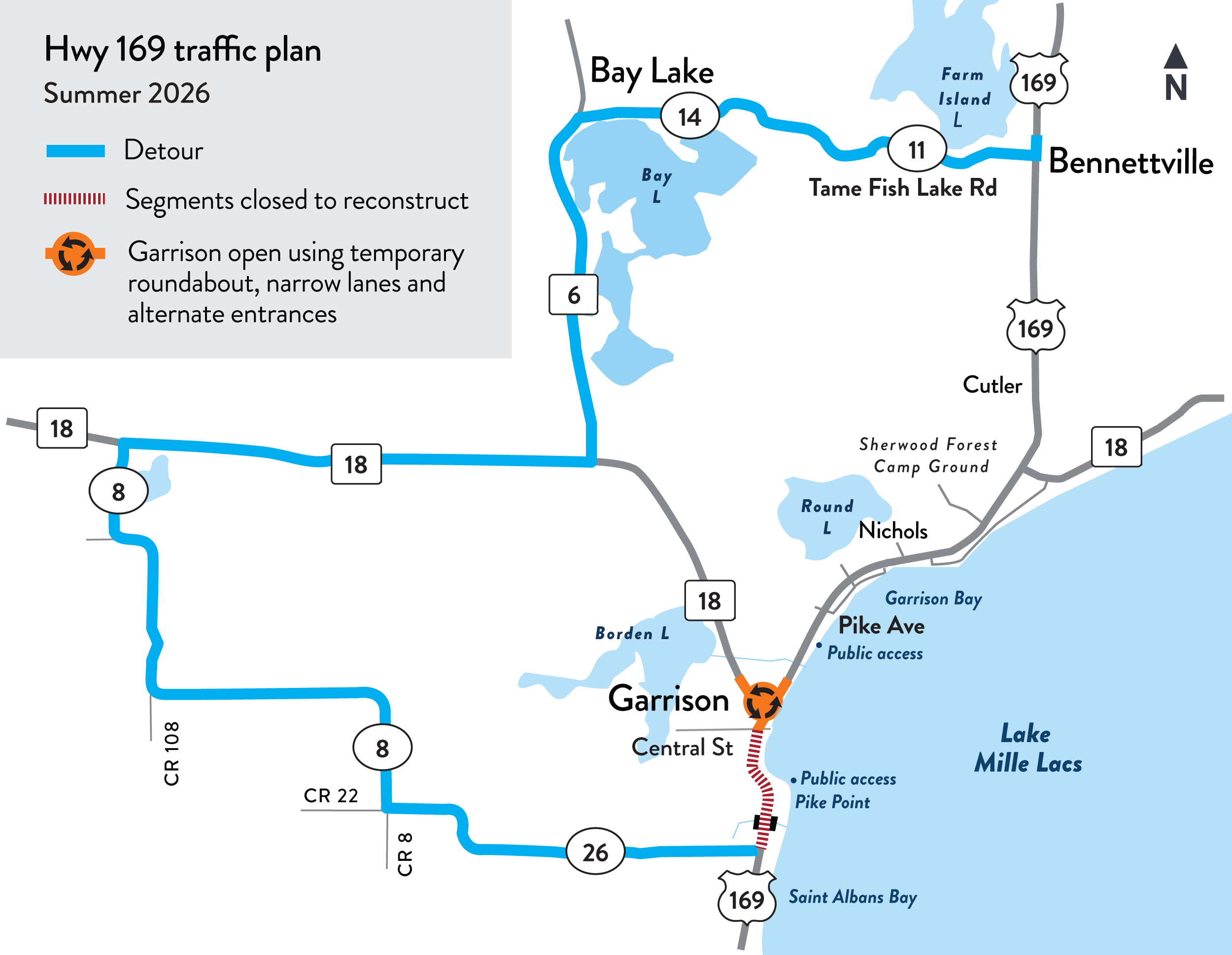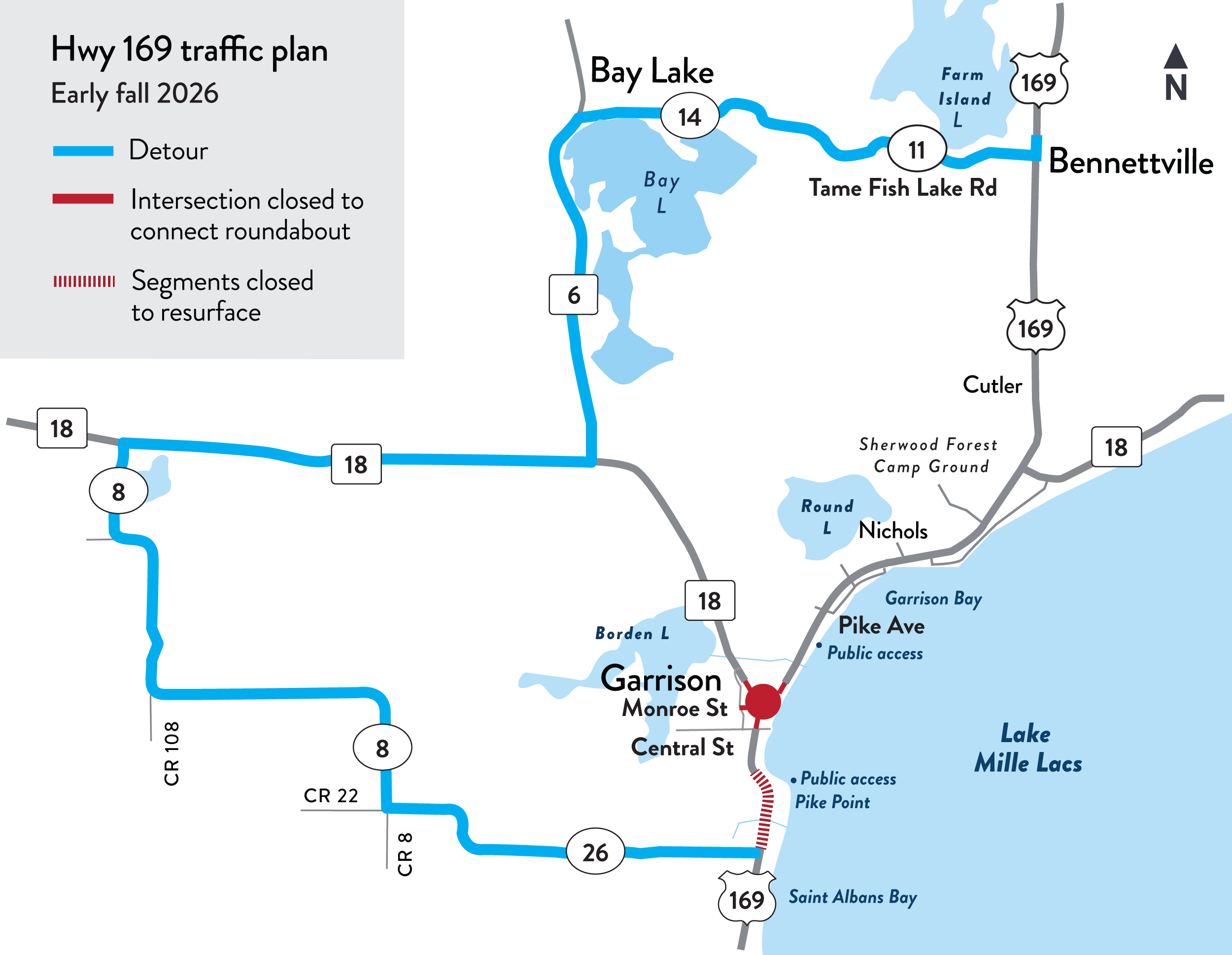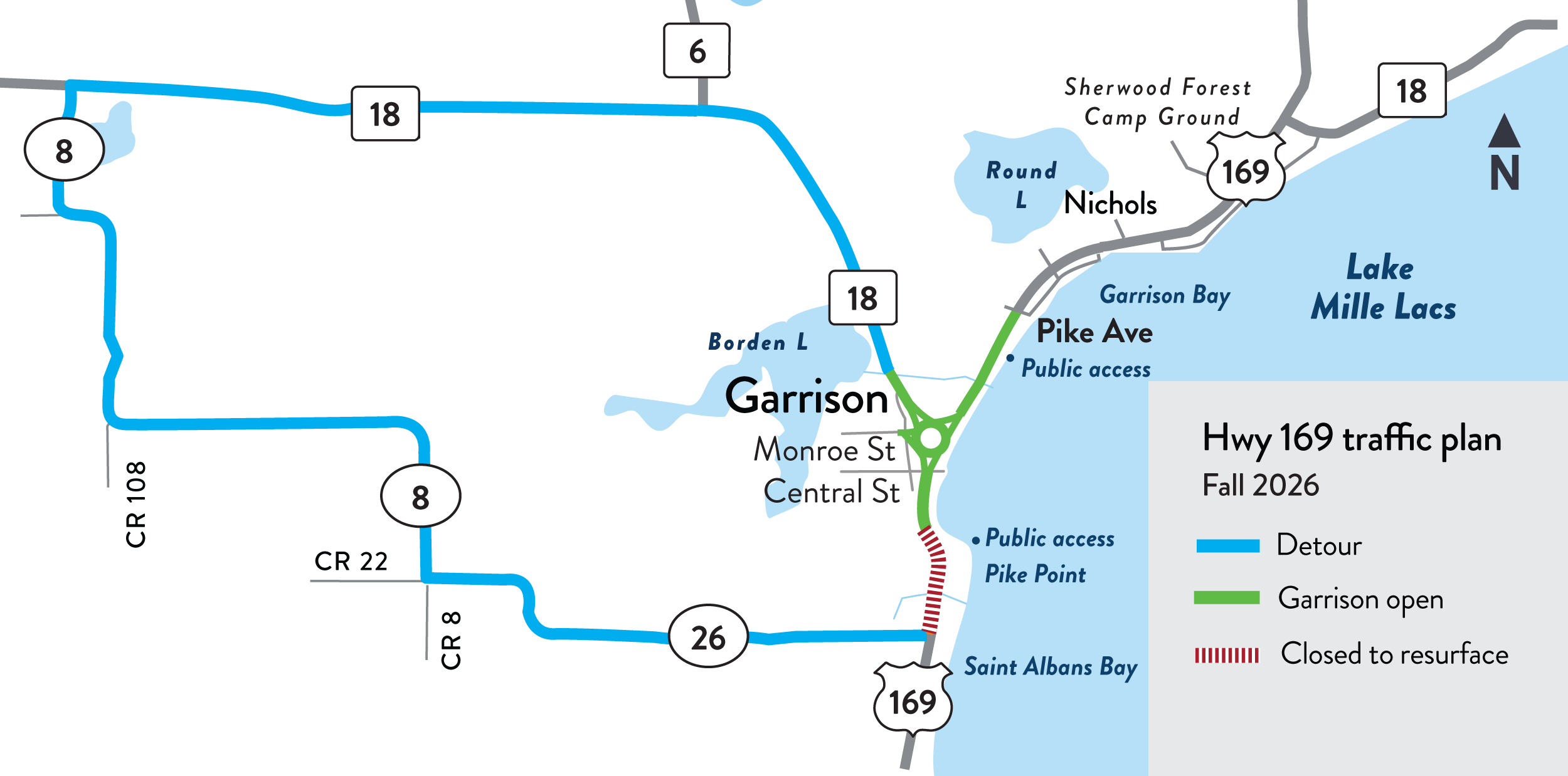 MnDOT will improve five miles of Hwy 169 from south of Garrison at Crow Wing Co. Rd. 26 to north of Garrison at Pike Ave.; includes city storm sewer, sidewalk and a new roundabout at the busy Hwy 18 intersection.