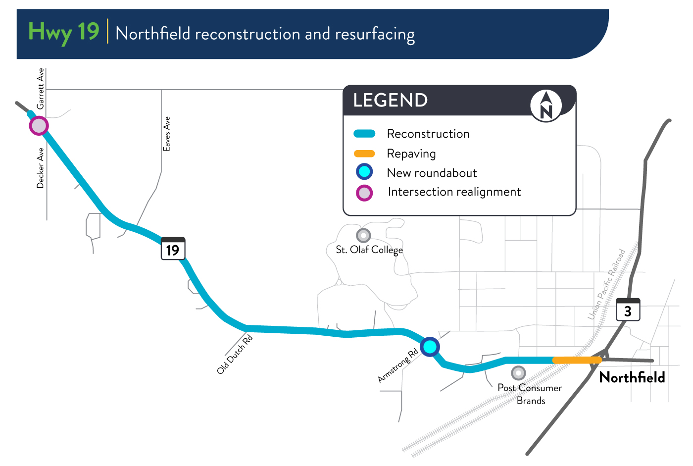 In 2028, a MnDOT contractor will reconstruct Highway 19 from Decker Avenue to the Union Pacific Railroad tracks just west of Highway 3 in Northfield and repave Highway 19 between the railroad tracks and Highway 3. The road will change from two lanes to add a continuous left turn in addition to the two lanes. A roundabout is proposed to be constructed at Armstrong Road. A trail will be constructed on the north side of Highway 19 from Decker Avenue to Highway 3 with additional improvements for pedestrians and bicycles from Armstrong Road to Highway 3.