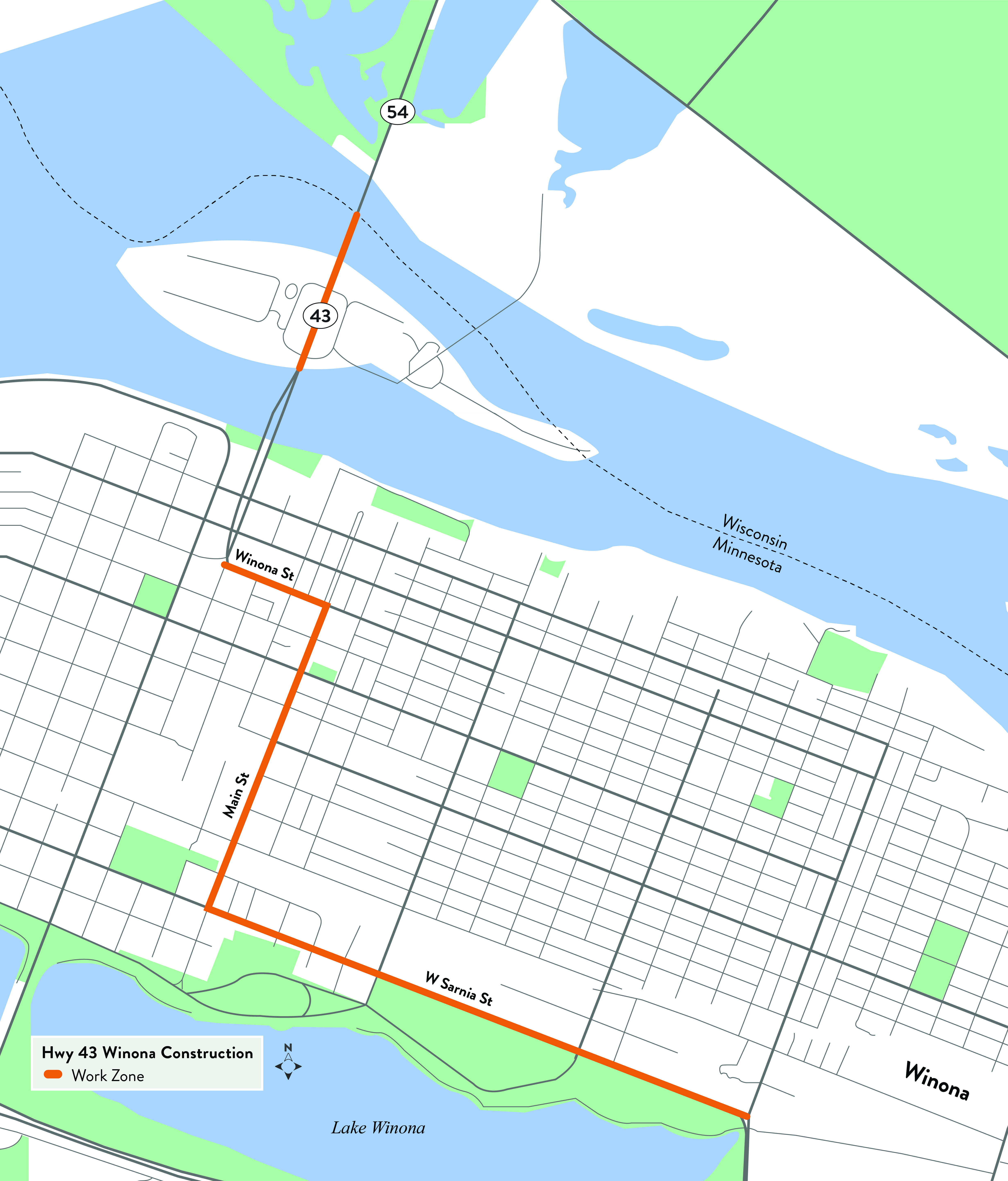 Construction is scheduled in 2028 along Highway 43 in Winona from Mankato Avenue to Winona Street. Highway 43 through Winona is also East Sarnia Street to Main Street to East Fourth Street. The route will include a repaving of the road, a three-lane section, improved bicycle lanes, sidewalks, crossing and signals.
