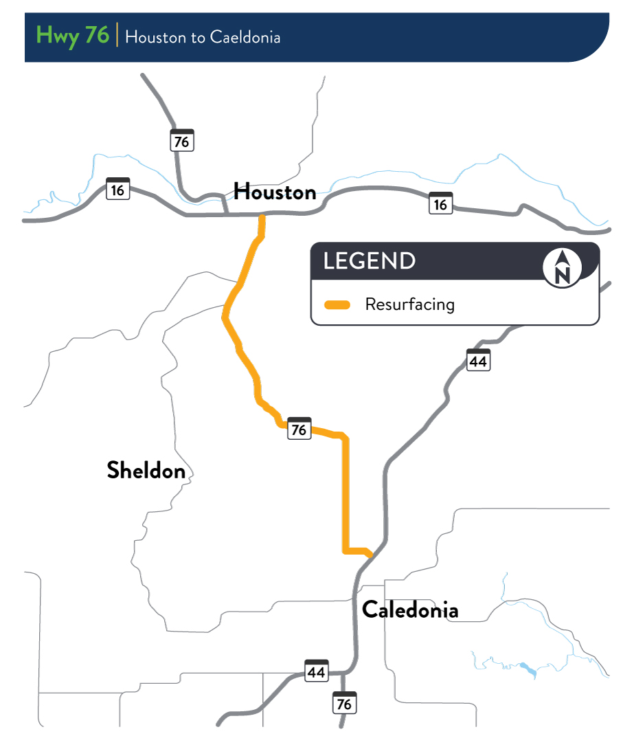 In 2028, MnDOT will resurface Highway 76 from Highway 44 to Highway 16 near Houston. Other work includes replacing culverts, guardrail, and minor bridge improvements. The project will provide a smoother road surface and extend the pavement life. It will also improve safety and drainage infrastructure.