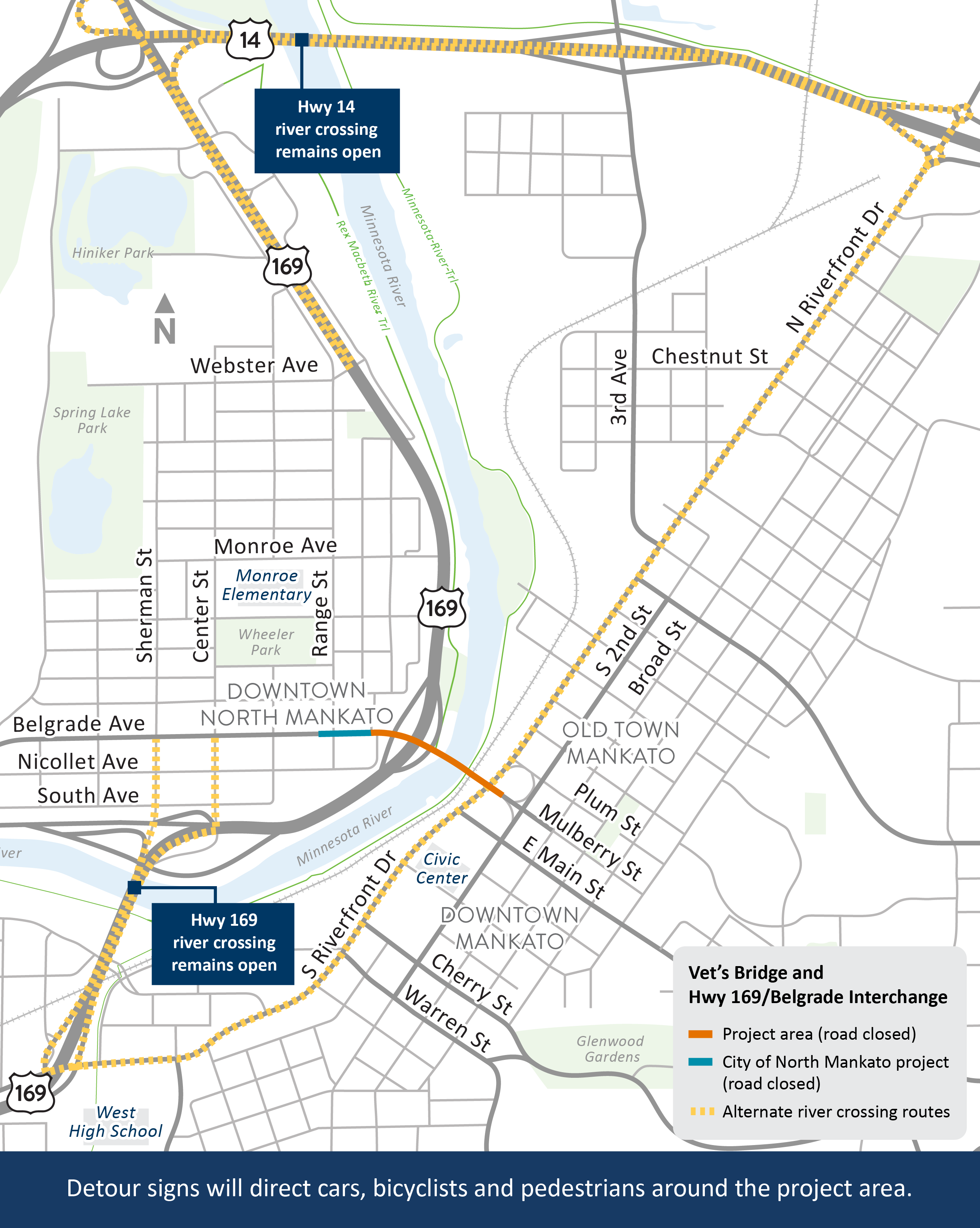 A bridge and ramp interchange project is planned at the interchange of Hwy 169 and Belgrade Ave., spanning across the cities of North Mankato and Mankato. In addition to repairing Veteran's Memorial Bridge, interchange signals will be replaced, ramp pavement will be improved, and sidewalks will be replaced.
