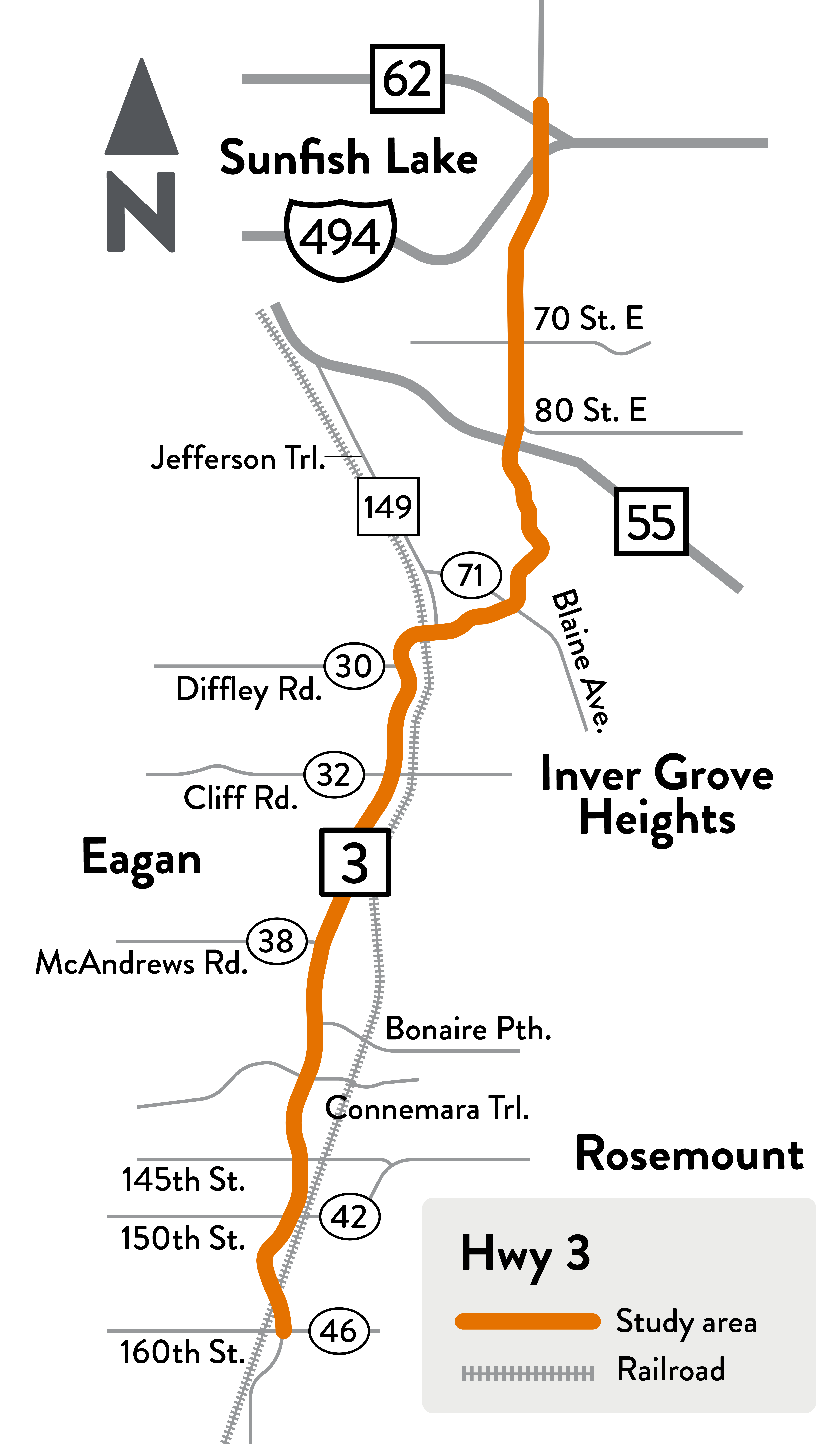 In coordination with Dakota County and the cities of Inver Grove Heights, Eagan and Rosemount, we are studying 12.5 miles of Hwy 3 from Hwy 62 in Inver Grove Heights to 160th St. (Co. Rd. 46) in Rosemount. The goal is to identify safety improvements for motorists, bicyclists, and pedestrians, and ensure the route works well into the future. It also will help shape future projects by setting clear goals, supporting area-wide priorities, and creating a plan for responsible growth.