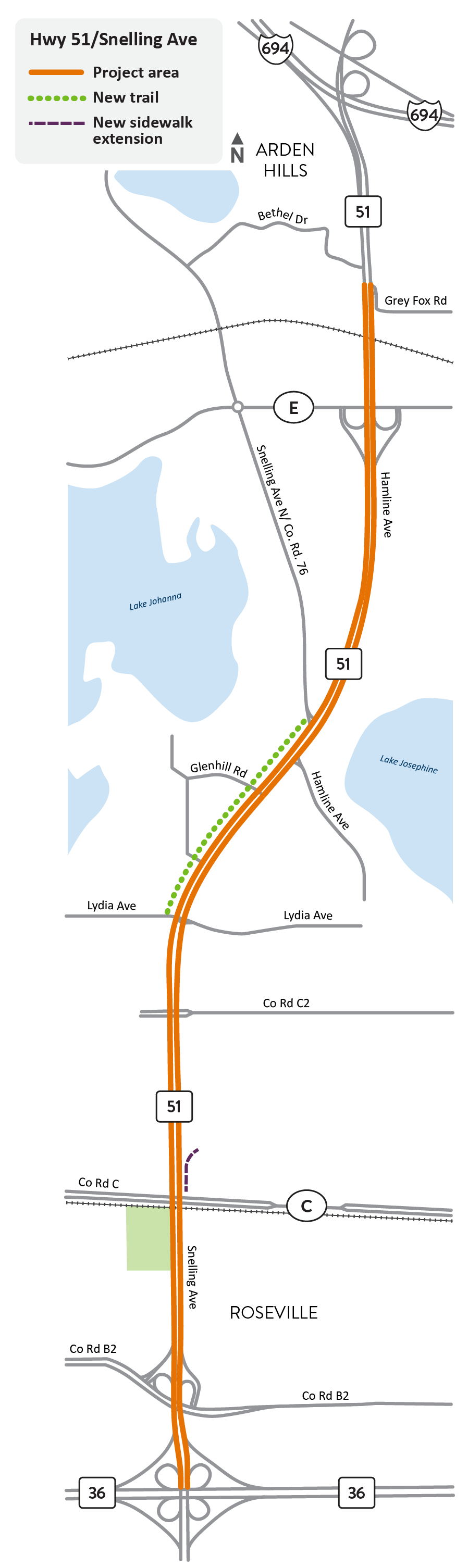 In 2026, we will repair and resurface Hwy 51/Snelling Ave./Hamline Ave. between Hwy 36 in Roseville and Grey Fox Rd. in Arden Hills to provide better ride quality and service life of the pavement. This project will also add connectivity with a new trail section providing access between Lydia Ave. and Snelling Ave. North (Ramsey Co. Rd. 76). This work is necessary to maintain the highway system and to make accessibility improvements.