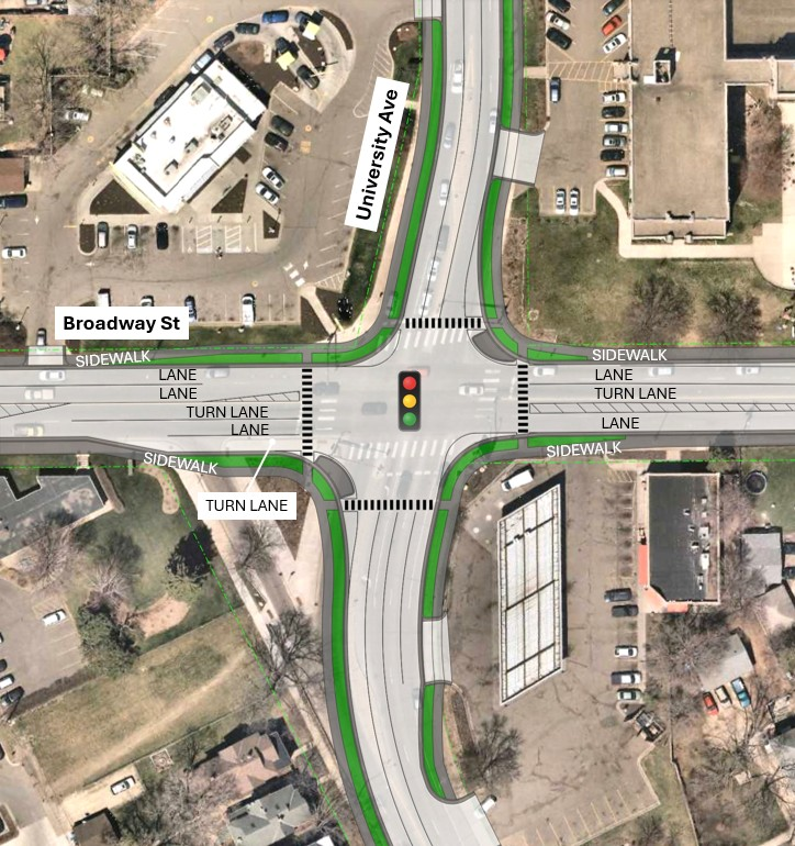 Broadway Street Northeast intersection with a traffic signal at this intersection. Changes include removing the separate right turn in the southwest corner to reduce conflicts between vehicles and pedestrians. Boulevard space would also be added between the roadway and the sidewalk.