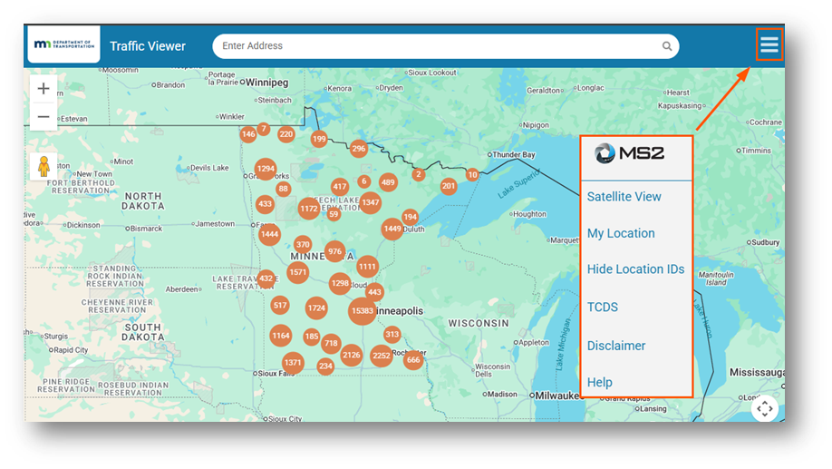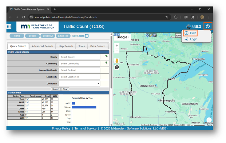 The traffic data available in the Traffic Viewer (TV) and Traffic Count Database System (TCDS) reflects accurate reproductions of records maintained by MnDOT. While we strive to provide reliable information, MnDOT cannot guarantee the accuracy of the underlying data and is not responsible for any misuse, misinterpretation, or misrepresentation of the data.